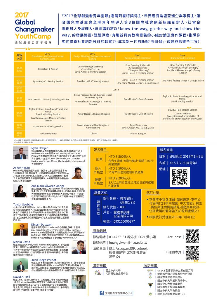 霍特獎得主、世界經濟論壇亞洲企業家得主、聯合國兒童基金會全球青年領導人等講師親自指導如何進行社會創新,發揮世界影響力活動資訊